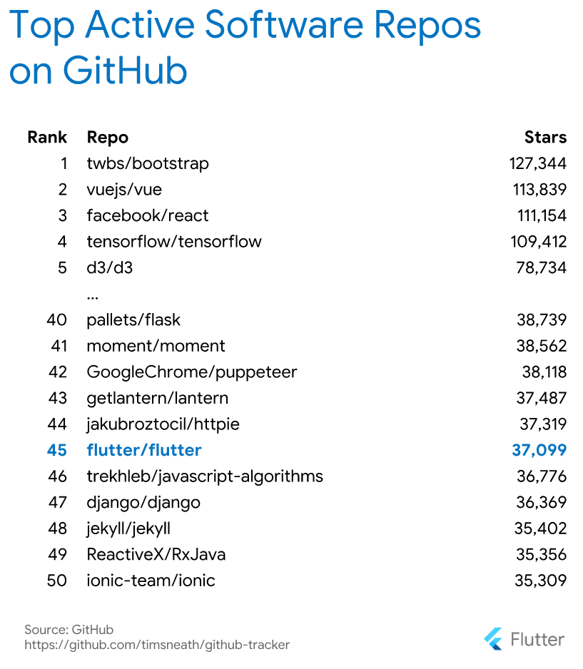 As many new developers continue to discover Flutter, we’re humbled to note that Flutter is now one of the top 50 active software repositories on GitHub: