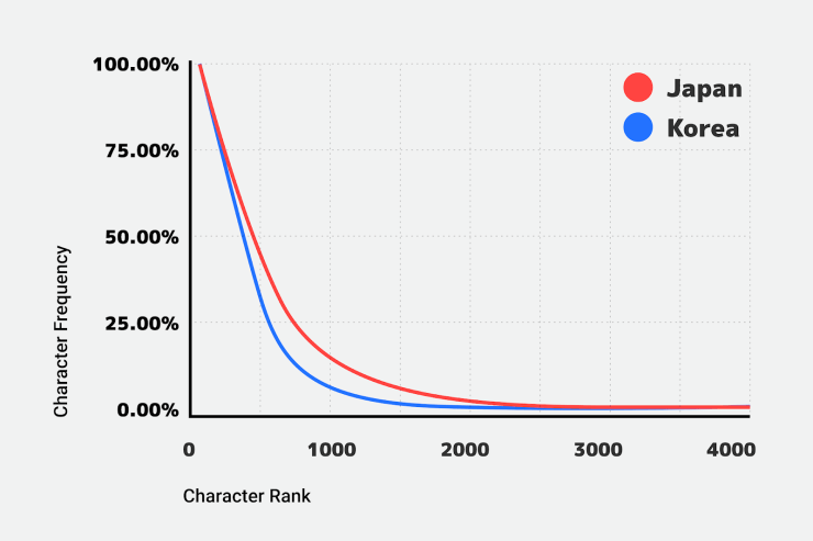 As shown above, Korean and Japanese have a relatively small set of characters that are used extremely frequently, and a very long tail of rarely used characters. On any given page most of the characters will be from the high frequency part, often with a few rarer characters mixed in.