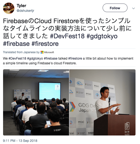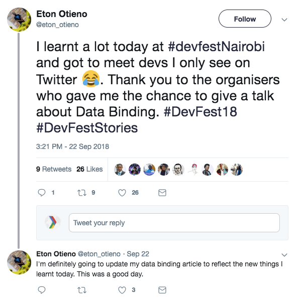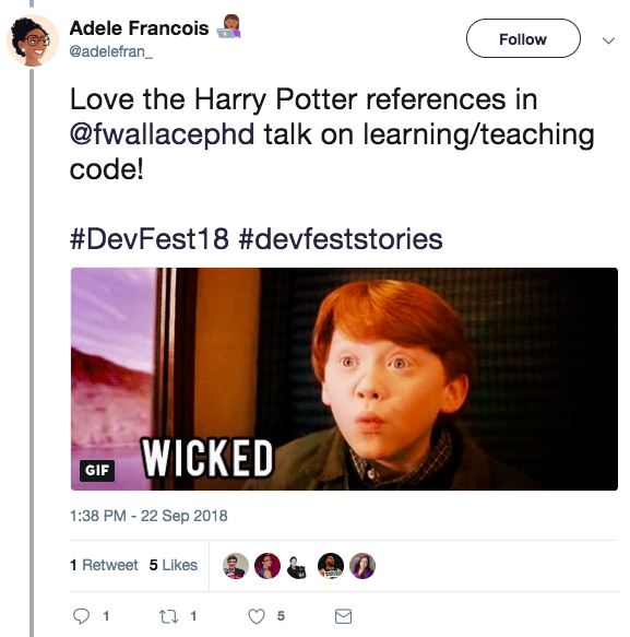 Our community is interested in hearing about what you learned at DevFest. Use #DevFestStories and #DevFest18 on social media. We would love to re-share some of your stories here on the Google Developers blog and Twitter! Check out a few great examples below.