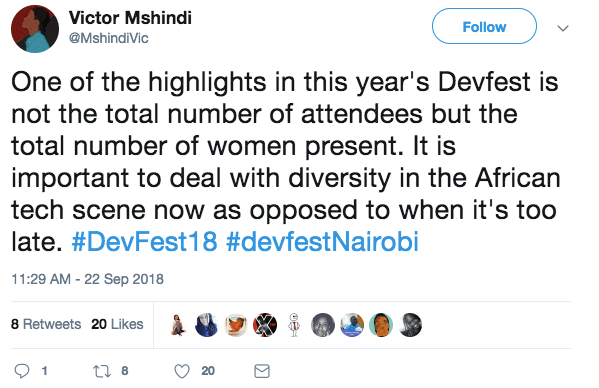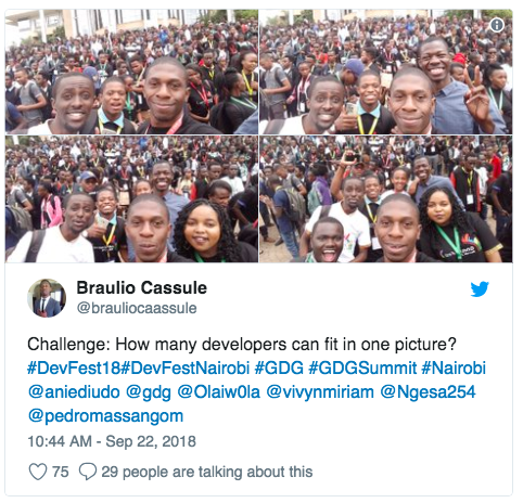 Most recently, GDG Nairobi hosted the largest developer festival in Kenya. On September 22nd, DevFest Nairobi engaged 1,200+ developers, from 26+ African countries, with 37% women in attendance! They had 44 sessions, 4 tracks and 11 codelabs facilitated by 5 GDEs (Google Developer Experts) among other notable speakers. The energy was so great, #DevFestNairobi was trending on Twitter that day!