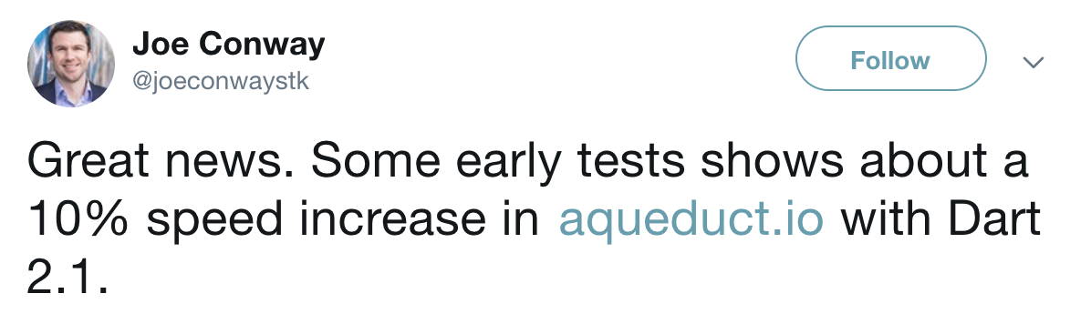 Flutter also includes the latest version of the Dart platform, 2.1, an update to Dart 2 that offers smaller code size, faster type checks, and better usability for type errors. Dart 2.1 also has new language features to improve productivity when building user experiences. Developers who have already adopted Dart 2.1 tell us they’re seeing significant speed improvements just by switching to the latest engine: