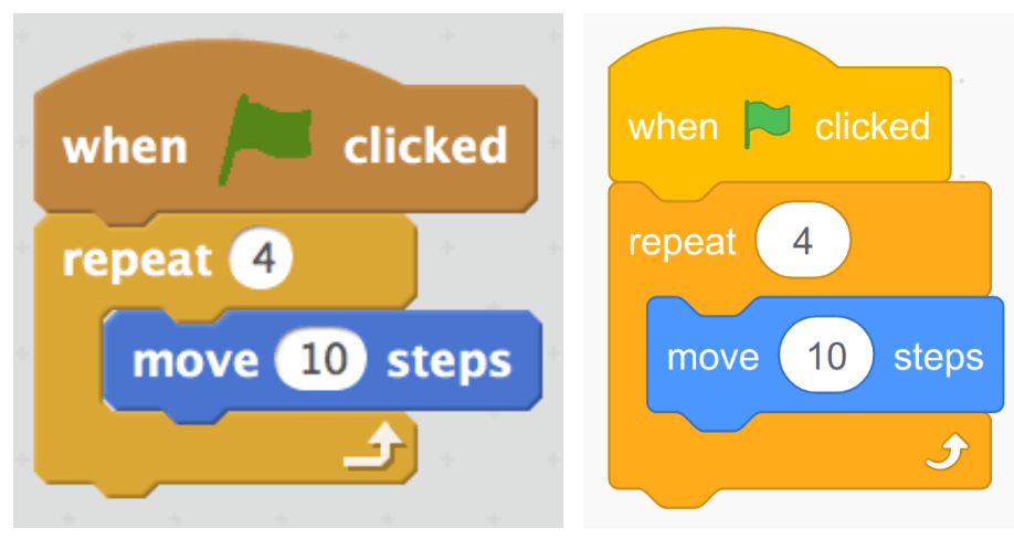 Left: Scratch 2.0’s code rendering. Right: Scratch 3.0’s new code rendering.