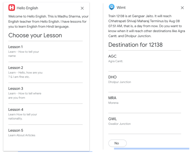 A couple of partners have already built Actions with these new audiences in mind. Hello English, for example, created an Action to offer English lessons for users that speak Hindi, to create more opportunities for people through language learning. And Where is My Train? (WIMT) was built for the millions of Indians commuting daily, offering real-time locations and times for trains accessible by voice. Check out our developer docs for KaiOS and Android Go Edition, and start building for the next billion users.