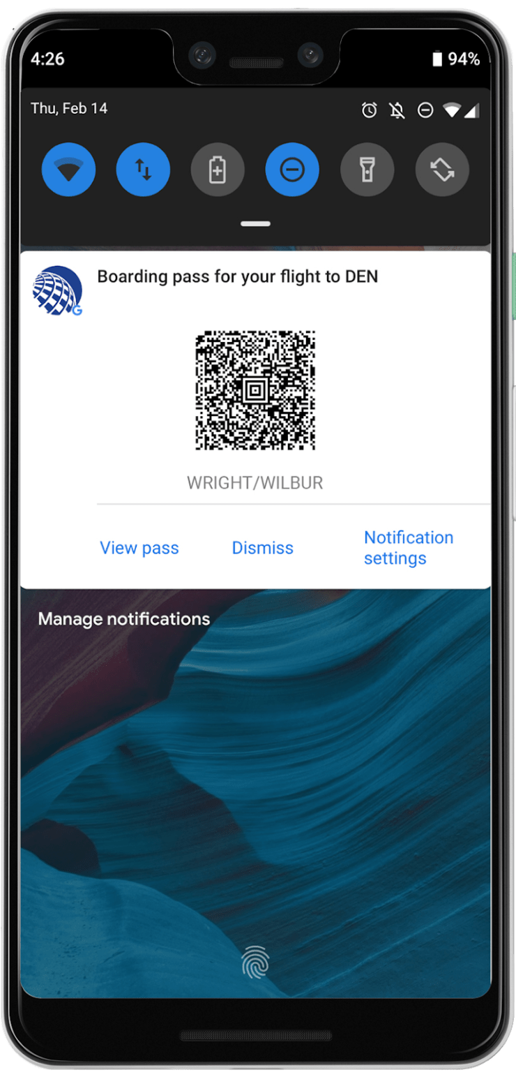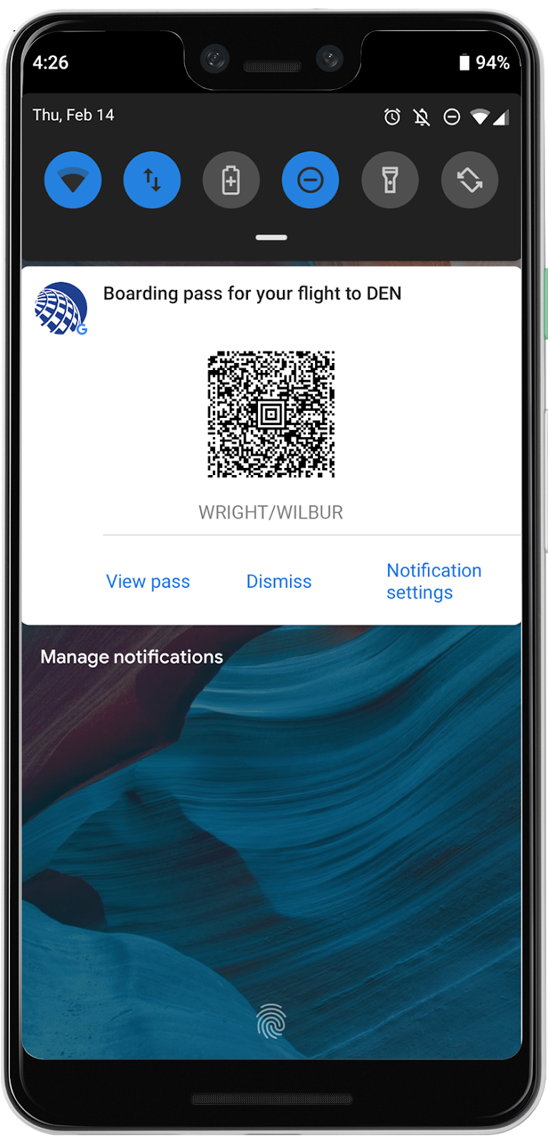 Your passengers can add their boarding pass to Google Pay for a seamless check-in experience. Google Pay sends the passengers a high priority notification with their boarding pass just a few hours before their flight so they can easily access it when needed. They’ll also receive notifications with important dynamic information like gate changes or flight delays. These notifications are high priority and will stay prominent on passengers’ phones until they dismiss it or their flight takes off.