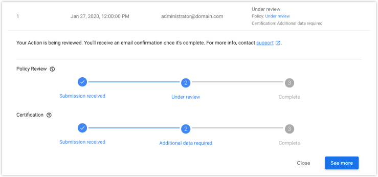Until now, developers did not have visibility into both phases of the review process. This was a common source of confusion as developers would receive notifications that their Action was approved during policy review, without realizing that certification was incomplete or still in process.