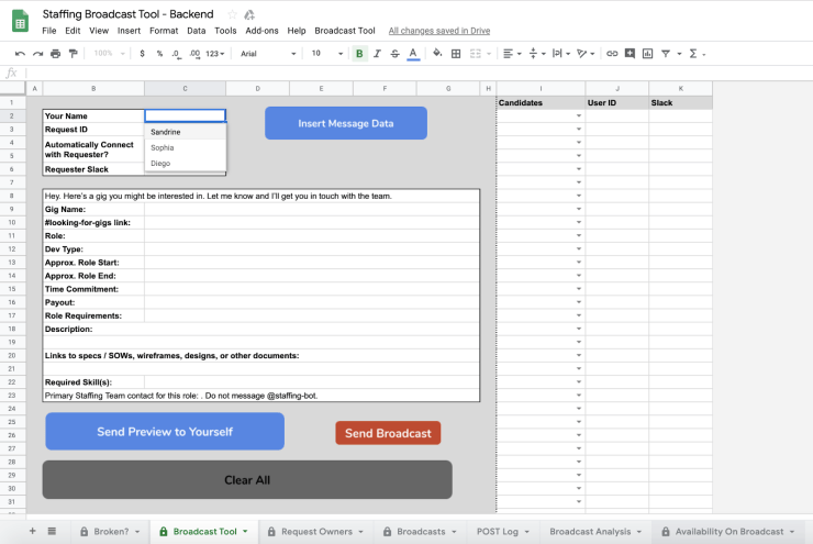 To interact with these APIs, we built a user interface directly into the Staffing Broadcast Google Sheet. By introducing an information module, as well as drop-down lists and buttons, we were able to define a small set of manual actions versus the much wider list of tasks the tool would perform automatically across multiple applications.