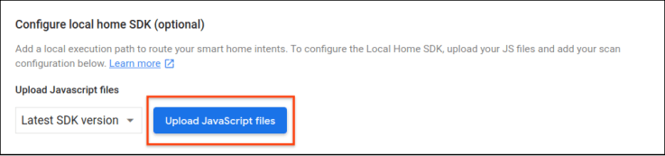 The Local Home SDK configuration page in the Actions console now accepts JavaScript bundles for your local fulfillment app. When you are ready to publish your app, upload your JavaScript files to the console and submit your Action. For more details on submitting your smart home Action for review, see the smart home launch guide.