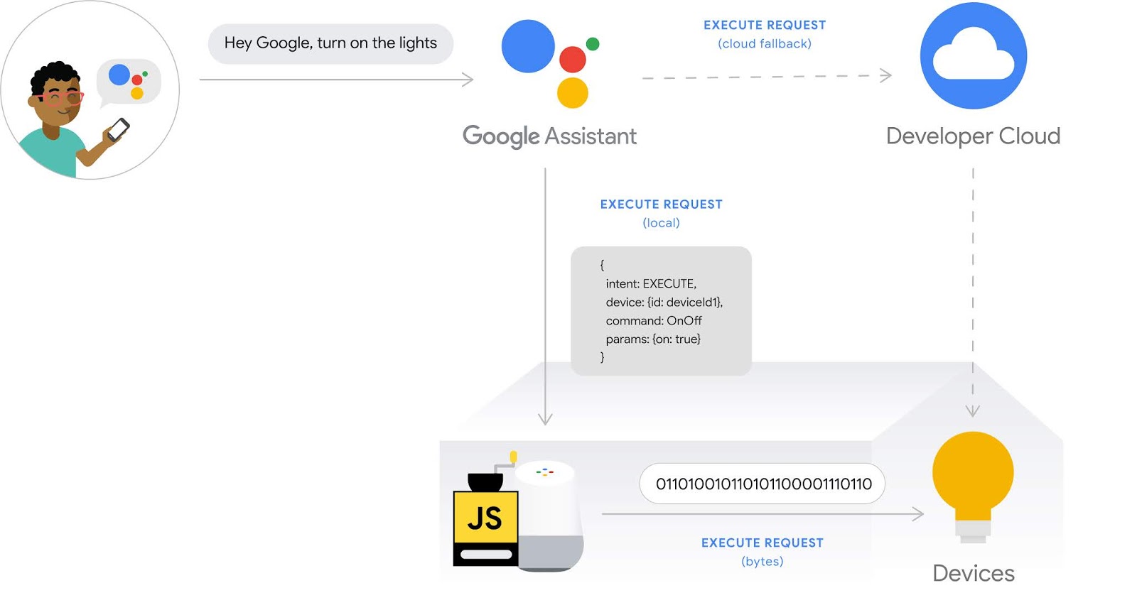 As part of the Smart Home platform, local fulfillment extends your smart home Action and routes commands to devices through the local network, benefitting users with reduced latency and higher reliability. If a local path cannot be successfully established, commands fall back to your cloud fulfillment.
