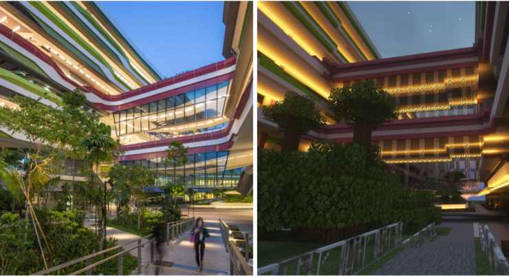 (On the left is the Singapore University of Technology and Design. On the right is a virtual model of the campus.)