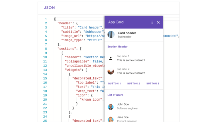 The biggest difference is the card markup — instead of using CardService, which under the covers builds a protobuf, we’re using the JSON representation of the same thing.