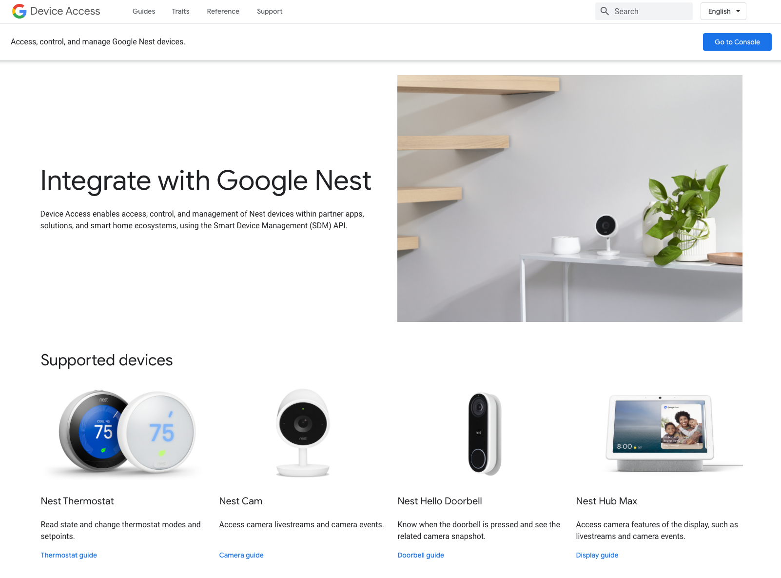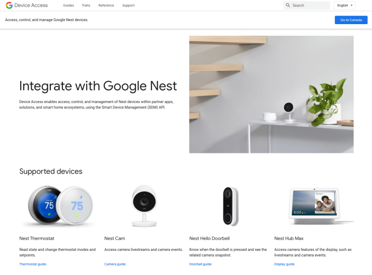 The Device Access program allows trusted partners to offer access, management, and control of Nest devices within the partner’s app, solution, and ecosystem. It allows developers to test all API traits in the sandbox environment, before moving forward with commercial integration. Learn more