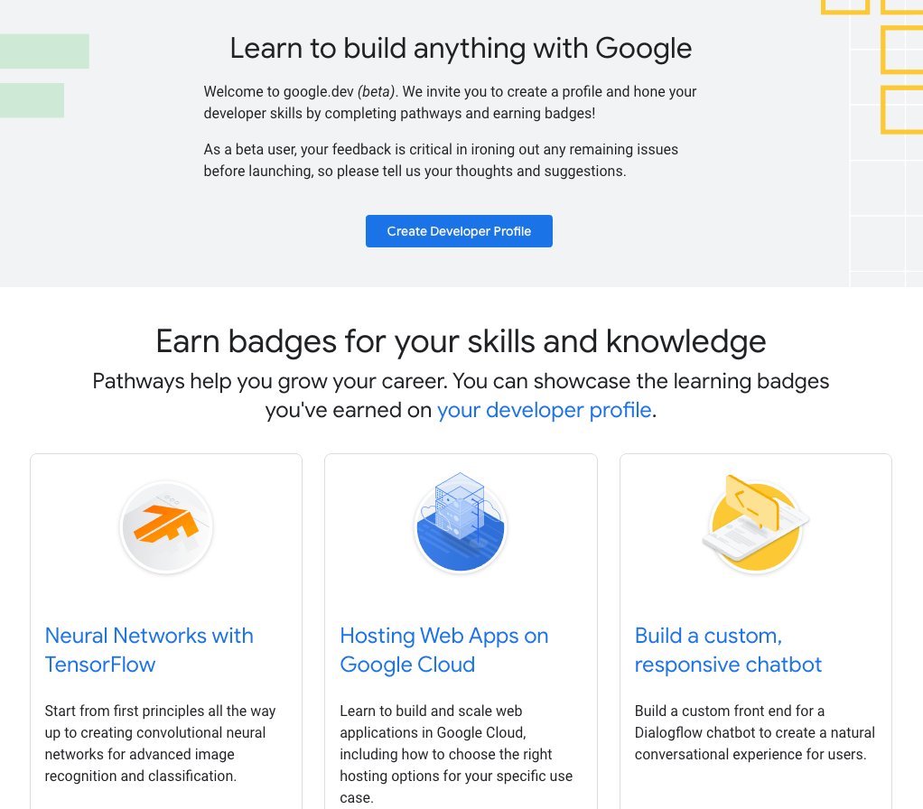 Previously, our educational content was separated by product area and platform. For example, you’d likely find Firebase Codelabs on firebase.google.com, and their video series on Youtube. We know you love these educational offerings, but they could be somewhat difficult to find, unless you were already in the know.
