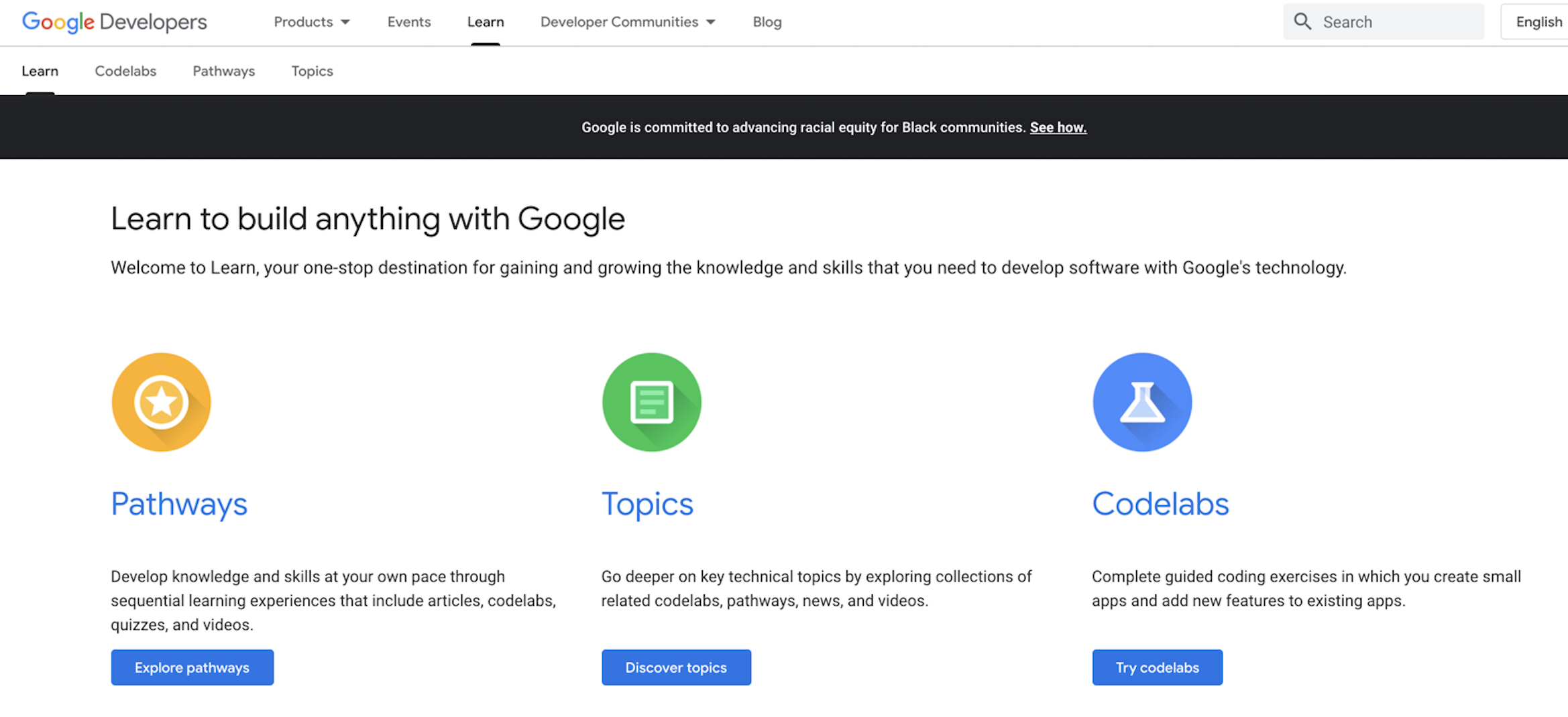 The home page of developers.google.com/learn