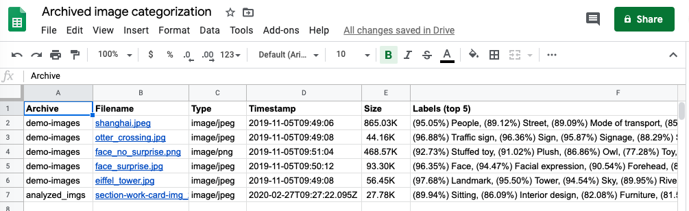 While this post may feature just pseudocode, a barebones working version can be accomplished with ~80 lines of actual Python. The rest of the code not shown are constants and other auxiliary support. The application gets kicked off with a call to main() passing in a filename, the Cloud Storage bucket to archive it to, a Drive file ID for the Sheet, and a “folder name,” e.g., a directory or ZIP archive. Running it several images results in a spreadsheet that looks like this: